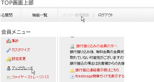 - 有料会員へ登録したいアカウントでfirestorageにログインします。 ログインしている場合は、「メンバー管理画面」または「会員プラン」をクリック してください。