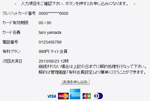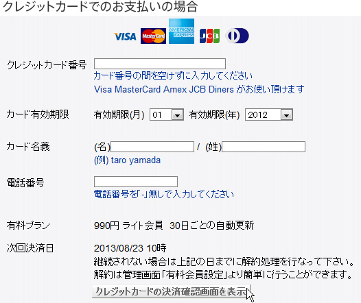 - 登録する会員プランをご確認の上、カード番号、カード有効期限、カード名義、電話番号を入力し、「確認画面を表示する」をクリックします。