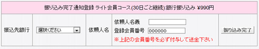 - 振込が完了しましたら、「振込先銀行」を選択し、「依頼人名義」「登録会員番号」を入力し「振り込み完了」をクリックしてください。